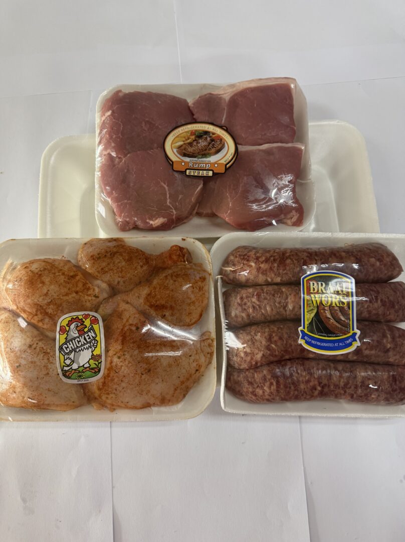 4 pieces of Rump, 4 Pieces of Wors, 600g Chicken drums and thighs