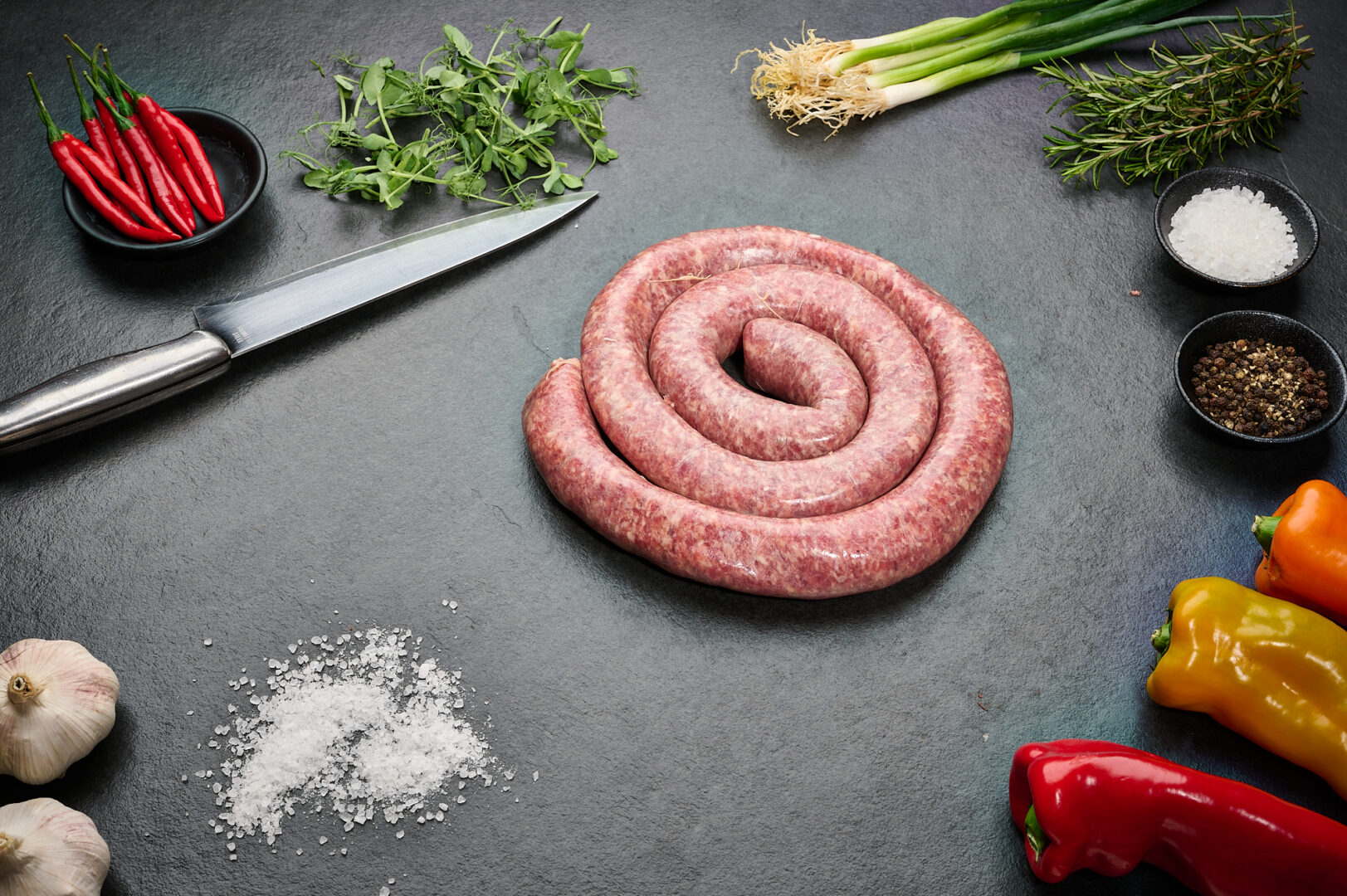 A traditional South African sausage made from coarsely ground beef , seasoned with a blend of spices .